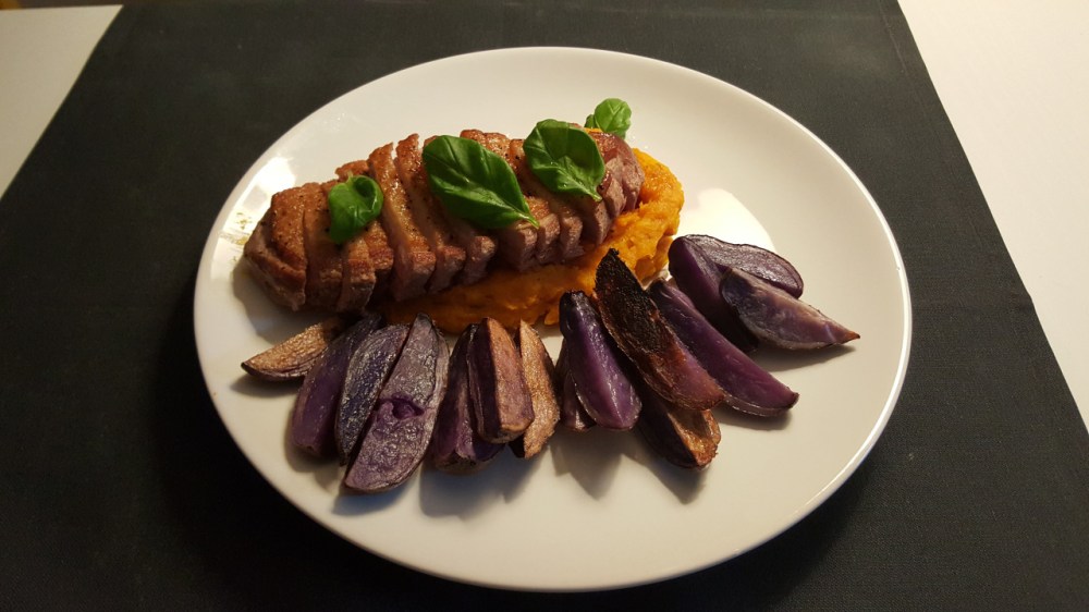Przepis na kaczkę z tego przepisu. Jako dodatek puree z pieczonej dyni i pieczone fioletowe ziemniaki.