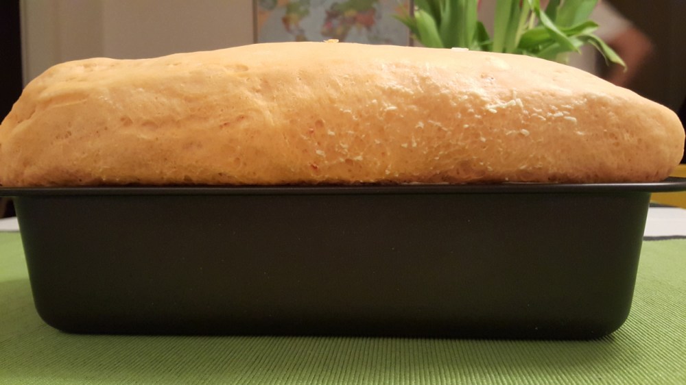 Ser zetrzeć na tarce. Wszystkie składniki, wraz z serem, połączyć i wyrabiać ciasto do momentu, aż będzie odchodzić od ręki. Przełożyć do wysmarowanej formy. Pozostawić na 40 min do wyrośnięcia. Piec w piekarniku nagrzanym do 200 stopni przez 40 min.