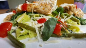 Pikantny kurczak z fasolką szparagową i pesto bazyliowo-migdałowym.